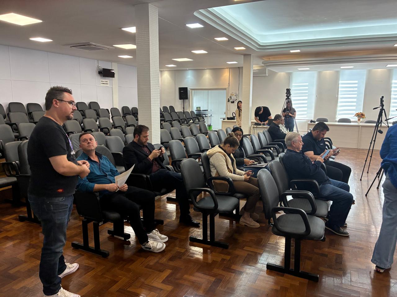 Tendo por local o Plenário David Líbero Gheller, aconteceu nesta terça-feira, dia 14 de outubro importante audiência pública, promovida pela Comissão de Finanças Orçamento e Contas Públicas da Câmara de Vereadores de Soledade. O ato foi presidido pelo vereador Edivaldo da Silva dos Santos (MDB), com o objetivo de debater o Projeto de lei nº 66/2025, que dispõe sobre as Diretrizes Orçamentárias para o exercício financeiro de 2026. A realização desta audiência atende ao disposto na Lei de Responsabilidade Fiscal e na Lei Orgânica Municipal, assegurando a comunidade soledadense o direito de acompanhar e participar do processo de elaboração e discussão das metas e prioridades da administração pública para o próximo exercício. Na oportunidade se fizeram presentes os vereadores Edivaldo da Silva dos Santos (MDB), Diego Vidaletti Silva (PP), Douglas Portela Perin (PSDB), Gustavo Moraes (PP), Cristiano Gambatto (MDB), secretária municipal de finanças e transparência Valeska Teloecken, além do assessor jurídico do legislativo Alexandre Turela, demais assessores da câmara, presidente do Simsol Tânia Rodrigues e imprensa.