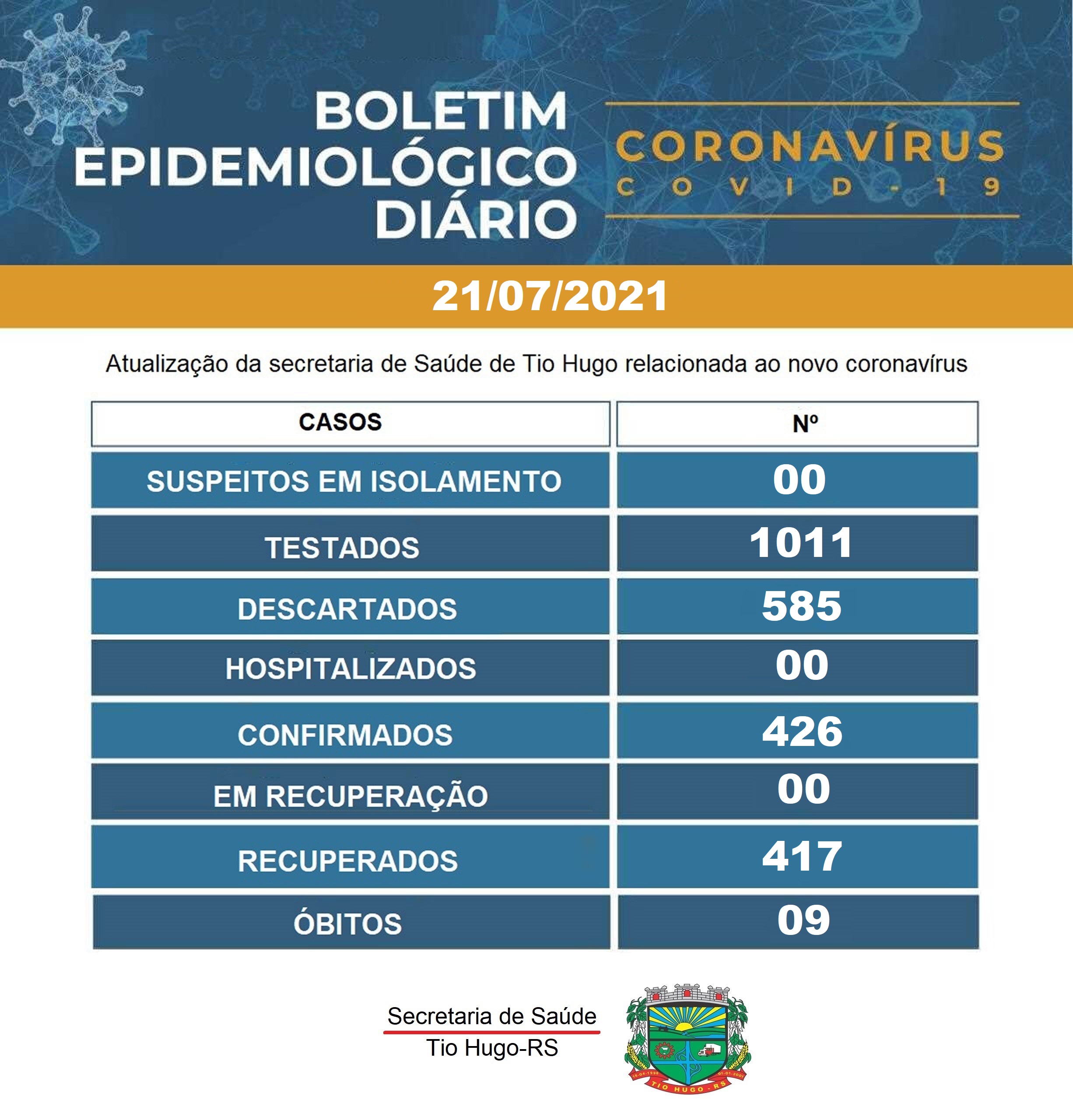 Uma pessoa recebeu alta e está recuperada da Covid-19. Desta forma no momento não há casos ativos da doença em Tio Hugo;
